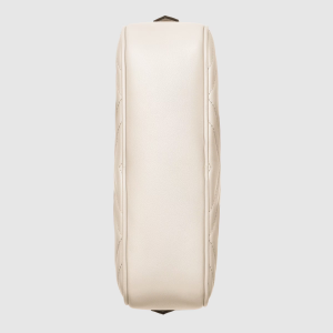 The small hand shoulder bag has a softly structured shape and a zip top closure with the Double G hardware. The shoulder strap has a leather shoulder detail. Made in matelassé leather with a design and on the back.