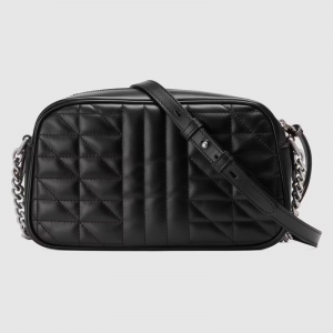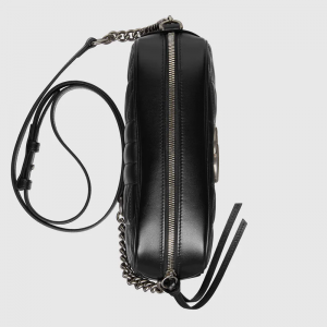 The hand is characterized by the brand’s emblematic Tote hardware and matelassé leather. For The Luxury Aria collection, the style is reimagined with a new geometric approach to the signature material while its Double G hardware is presented with an silver-toned finish. The design appears here in the shape of a small shoulder bag in black.