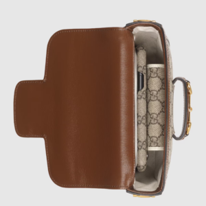 Petite versions of the Luxury hand add a hybrid twist to the inspired line. Enriched with two different shoulder straps, the mini bag’s character transforms from understated elegance with a tonal leather strap to a strong logo feel thanks to a red and green Web option. The accessory is presented in Tote canvas with a brown leather trim.