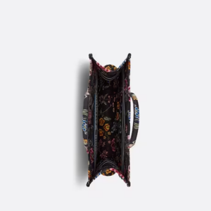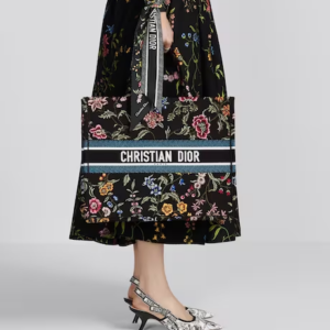 Introduced by Maria Grazia Chiuri, Creative Director of Christian Dior, the Dior Book Tote has become a staple of the Dior aesthetic. Designed to hold all daily essentials, the style is fully embroidered with a black multicolor Dior Petites Fleurs motif, a romantic and vibrant homage to Mr. Dior’s passion for florals. Adorned with the Christian Dior Paris signature on the front, the large tote exemplifies the House’s signature savoir-faire and may be carried by hand or worn over the shoulder.