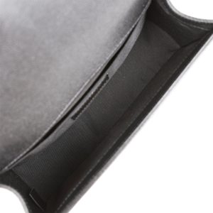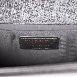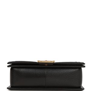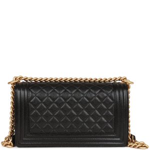 This Old Medium Boy bag is in black?caviar leather with antique gold tone hardware and features a full front flap with the Le Boy CC push lock closure and an antique gold tone chain link and black leather padded shoulder/crossbody strap.