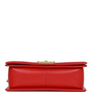 This Old Boy bag is in red leather with?tone hardware and features a full front flap with the Le Boy push lock closure and an tone link and red leather padded shoulder/crossbody strap.