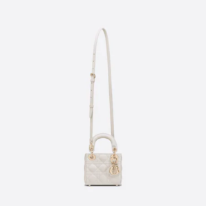 The Lady Dior bag embodies the House’s vision of elegance and beauty. Crafted in latte lambskin with signature Cannage topstitching, its iconic silhouette is embellished with a ‘D.I.O.R.’ charm. The micro Lady Dior bag can accommodate all the daily essentials and features an adjustable and removable shoulder strap, allowing it to be carried by hand, worn over the shoulder or crossbody.