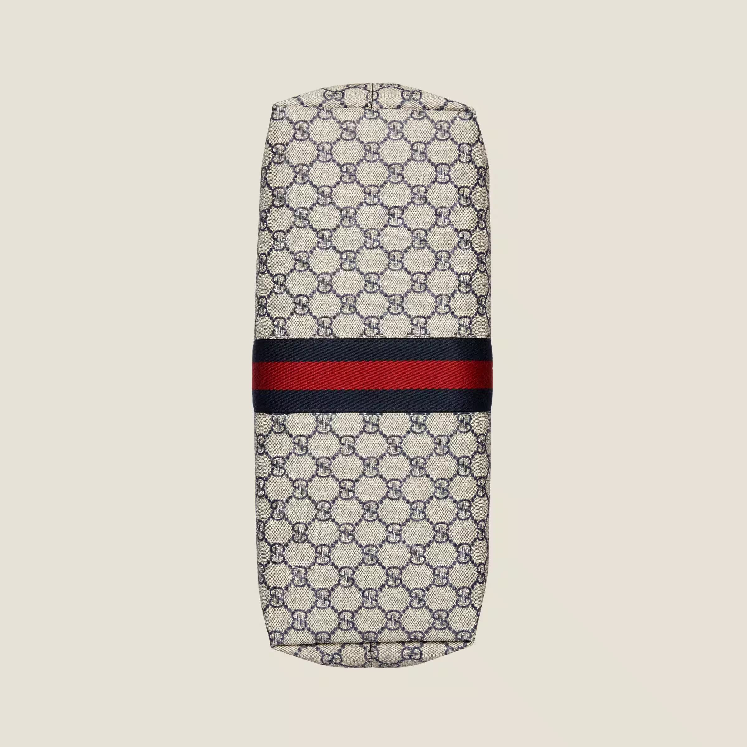 Mirroring the material’s historic origins, is introduced in a timeless mix of blue and beige for Luxury Love Parade. The canvas has come to the front of each collection decade after decade to become a hallmark of the House. Here, the palette defines this medium-sized tote bag, completed by the Web stripe in red and blue.