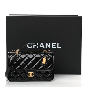 This is an authentic Luxury Small Top Handle Flap in Black. This stunning small shoulder bag is finely crafted of diamond leather in black. The bag features a rolled leather top handle. a long aged link shoulder strap threaded with leather and a frontal flap with an aged Luxury turn lock. This opens to a black leather interior with zipper and patch pockets.