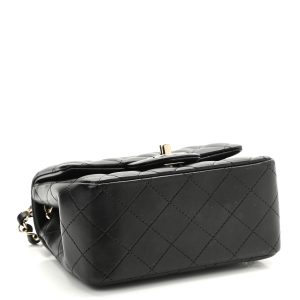 This is an authentic Lambskin Quilted Mini Square Flap in Black. This classic bag is finely composed of luxurious diamond quilted lambskin leather in black. The bag features a waist-length light gold chain link leather threaded shoulder strap and a light gold CC turn lock. This opens the front flap to a black leather interior with a zipper and patch pockets.