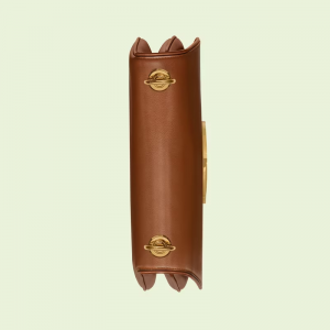 Coming from the House’s archives, a geometrically shaped version of the Interlocking G logo is reintroduced for Luxury Love Parade. The emblem enriches the design with a timeless feel—mirroring the Hollywood glamour that shaped the fashion show. This medium-sized version of the accessory is presented in brown leather.