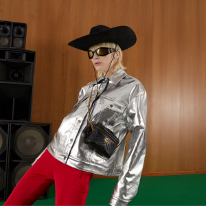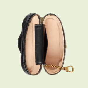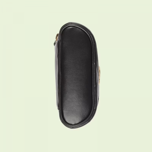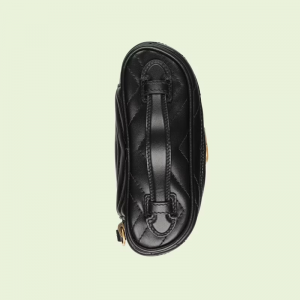 A zip around mini bag with a top handle is presented within the hand collection. Crafted from the line’s signature matelassé leather in black, the rounded shape is enriched with the Double G detail. Featuring a detachable strap, the accessory can be styled in different ways.