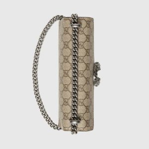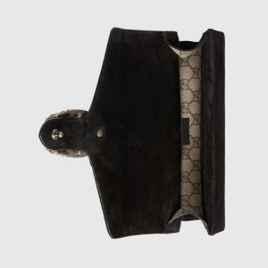 The small shoulder bag is presented in the signature pattern, trimmed with black suede details. The shape is defined by the defining tiger head closure—a unique detail referencing the Greek god Dionysus, who in myth is said to have crossed the river Tigris on a tiger sent to him by Zeus—further enhanced with sparkling crystals. The sliding strap can be worn multiple ways, changing between a shoulder and a top handle bag.