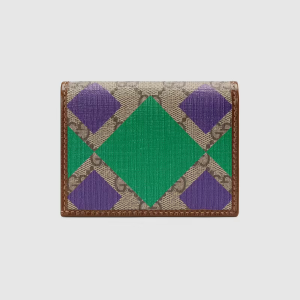 This item features bright and colorful geometric motifs that recall the uniforms worn by horse riding jockeys. The collection is inspired by the Parade Ring, or paddock, where horses walk around as a warm-up before the race and to help racegoers pick a winner. Here the print appears on this Luxury hand card case wallet.