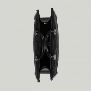 Signature luage pieces from the jumbo line spotlight an all-black design for Spring Summer 2023. A reinterpretation of Luxury o Luxury ‘s initials, the features prominently in size for a distinctive logo feel atop this tote bag with additional shoulder strap.