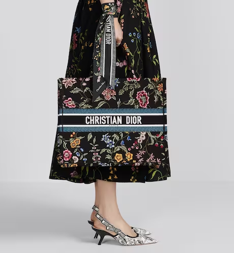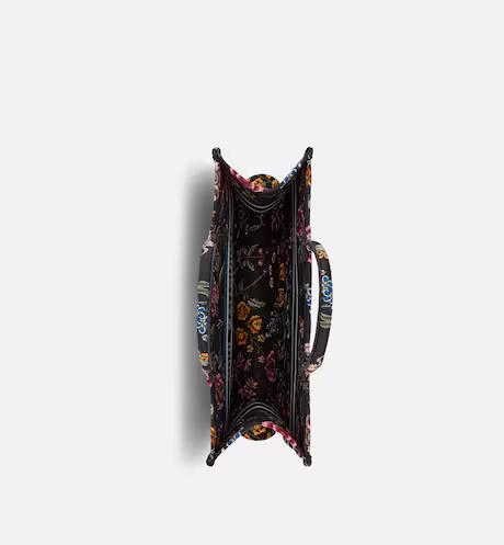 Introduced by Maria Grazia Chiuri, Creative Director of Christian Dior, the Dior Book Tote has become a staple of the Dior aesthetic. Designed to hold all daily essentials, the style is fully embroidered with a black multicolor Dior Petites Fleurs motif, a romantic and vibrant homage to Mr. Dior’s passion for florals. Adorned with the Christian Dior Paris signature on the front, the large tote exemplifies the House’s signature savoir-faire and may be carried by hand or worn over the shoulder.