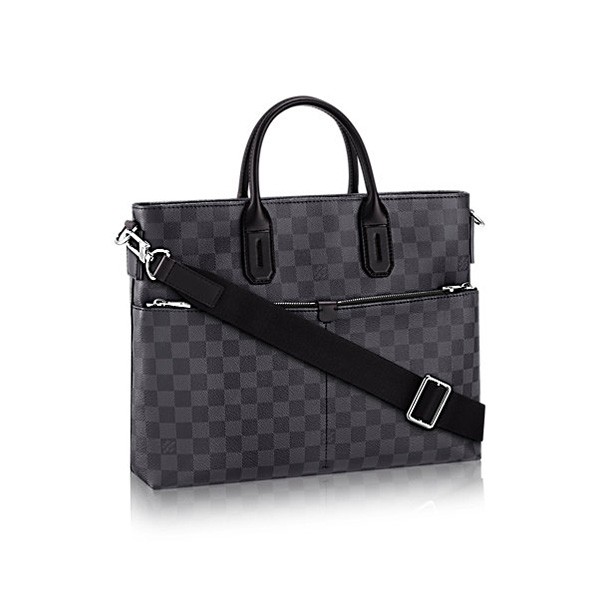 40 x 32 x 9 cm (Length x heightx width ) •Damier Graphite (canvas) exterior•Textile lining•Cowhide leather trim•Sier color metallic pieces•Adjustable & removable shoulder strap in textile•2 external zipped pockets•iPad pocket•4 flat pockets & double pen loops