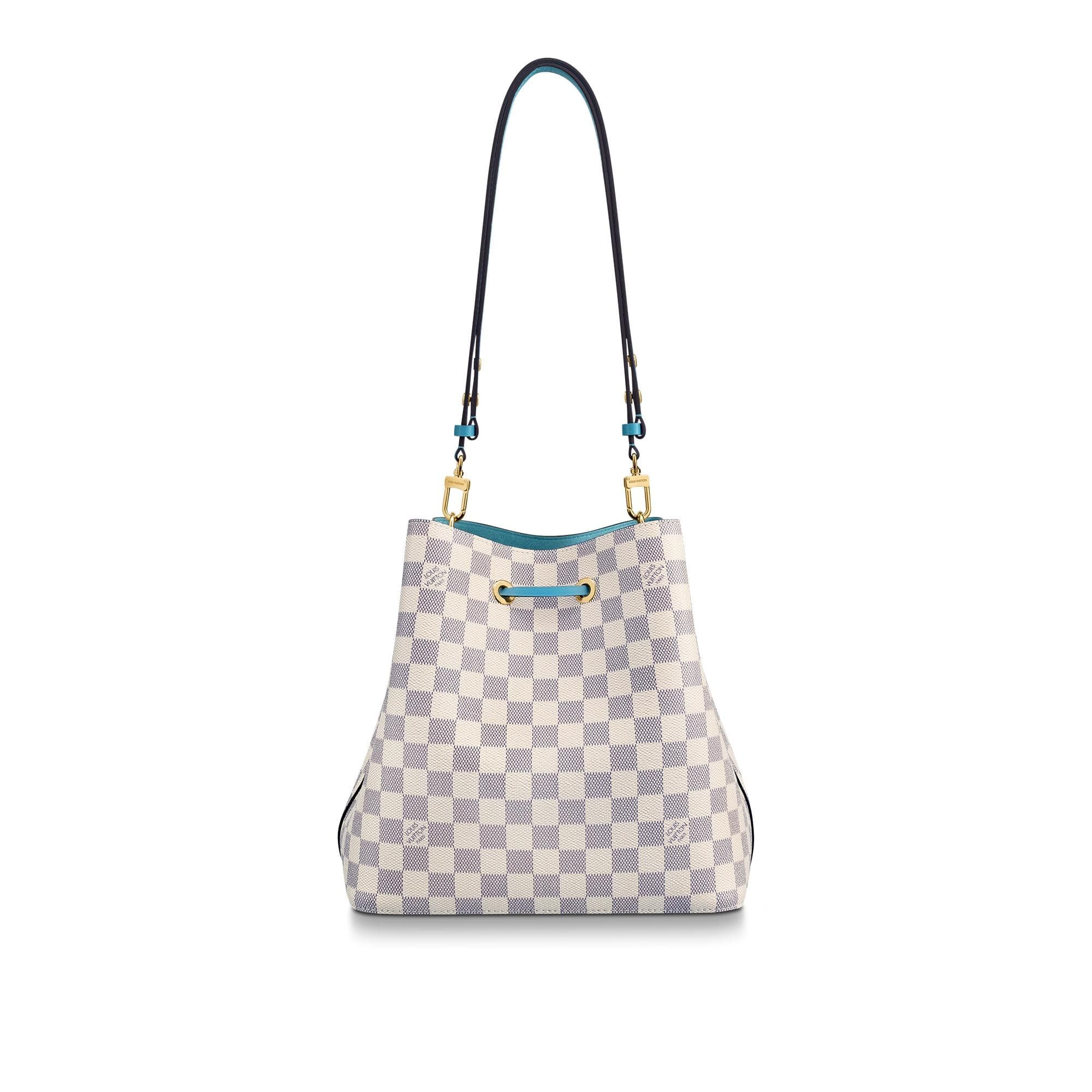This limited edition of the bucket Bag in Damier Azur canvas captures the very spirit of summer with its pastel leather trim and colorful coordinated lining. It will bring a sunny, seasonal touch to any beach-to-city outfit, either slung over the shoulder or worn cross-body, thanks to the removable, adjustable strap.