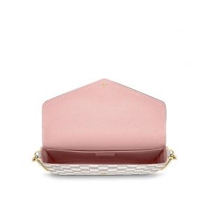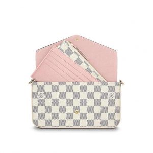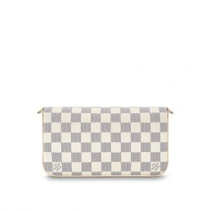 With its two removable interior pockets, the elegant Felicie in Damier Azur canvas is the stylish solution to carry and organise all your daily essentials. Much more than a wallet, it can be transformed into a glamourous shoulder bag or clutch thanks to its removable golden chain.