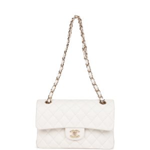 This Small Double Flap bag is in white leather with light tone hardware and features a front flap with signature turnlock closure. half moon back pocket. and adjustable interwoven light tone link and white leather shoulder strap.