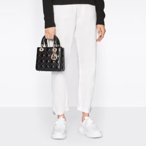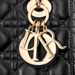 The Lady Dior My ABCDior bag epitomizes Dior’s vision of elegance and beauty. Sleek and refined, the timeless style is crafted in black lambskin with Cannage stitching, creating the instantly recognizable quilted texture. Pale gold-finish metal D.I.O.R. charms offer elegant appeal. Featuring a shoulder strap that can be personalized with badges, the small, unique design may be carried by hand or worn crossbody.