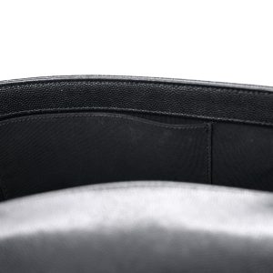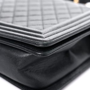 This is an authentic Caviar Quilted New Medium Boy Flap in Black. This stylish shoulder bag is crafted of luxurious diamond quilted caviar leather in black. The bag features a gold tone chain link shoulder strap with a leather shoulder pad. and a linear quilted border with a gold boy CC push lock. This opens to a black fabric interior with zipper and patch pockets.