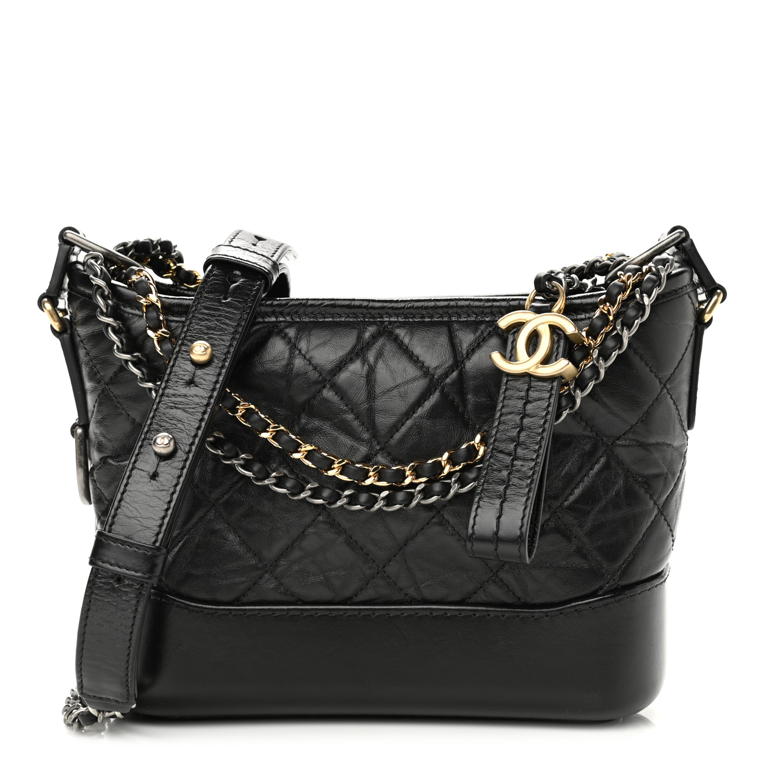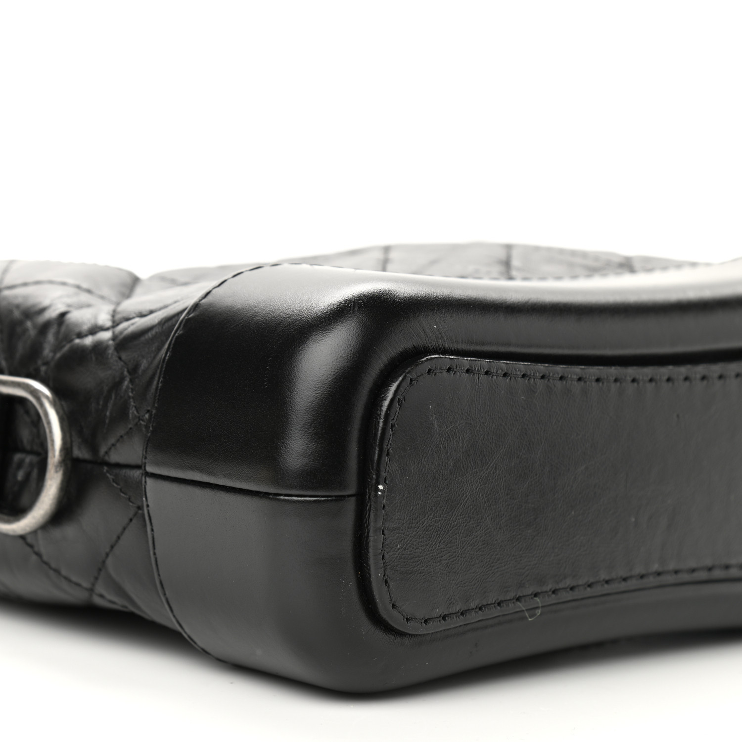 This is an authentic Aged Small Hobo in Black. This chic shoulder bag is crafted of diamond-stitched aged leather in black. It features a sturdy smooth black base. and thin gold-tone. silver-tone. and ruthenium link leather threaded shoulder straps with a shoulder pad. The top zipper features an aged zipper pull and opens to a red fabric interior with zipper and patch pockets.